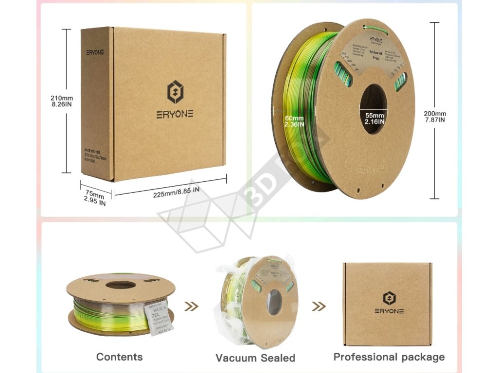 Der Herstellungsprozess von Regenbogenfilamenten basiert auf einer kontinuierlichen Zufallsmischung der einzelnen Farben. Dies kann zu Spulen führen, die entweder ein Gleichgewicht aus dunklen und hellen Farben oder eine insgesamt dunklere/hellere Spule enthalten. Der Glanz der entstehenden PLA-Produkte hängt von der Temperatur ab, bei der das Produkt gedruckt wird.