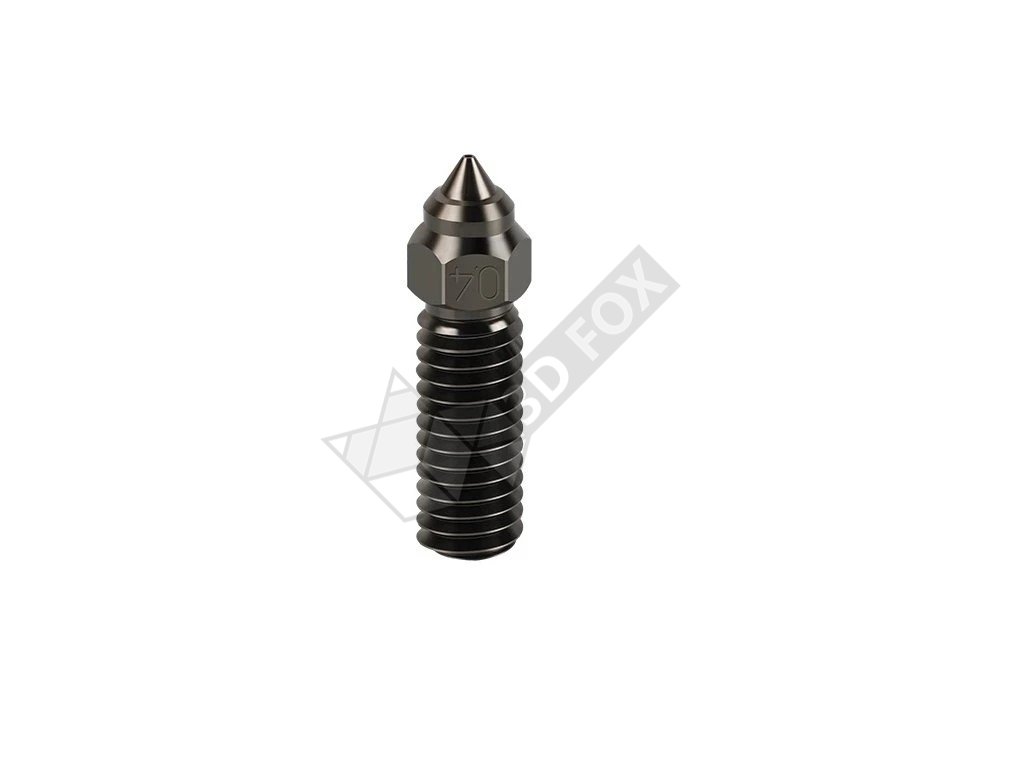 Gehärtete Stahldüsen sind ideal für die Verarbeitung von Filamenten mit abrasiven Partikeln. Speziell gehärtete Stahldüsen sind beim 3D-Druck nahezu unzerstörbar. Ob es sich um Filamente mit Kohlenstoff-, Metall-, Holz- oder Leuchtstoffpartikeln handelt, gehärtete Stahldüsen sind die richtige Wahl. Gehärteter Stahl ist durch seine gehärtete Oberfläche nahezu verschleißfrei, und unsere Erfahrung zeigt, dass eine Düse aus diesem Material länger hält als der Drucker selbst.