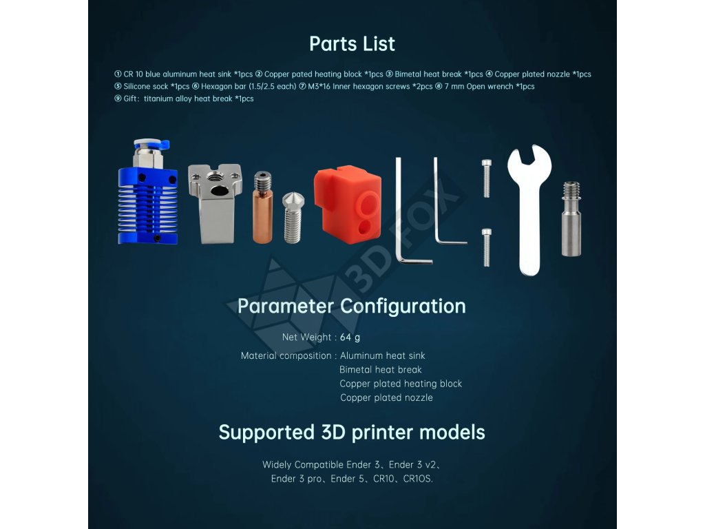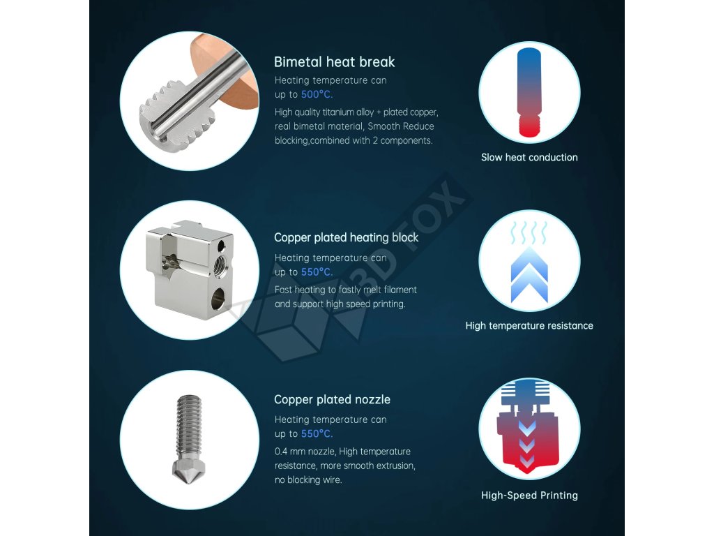 Neuartiges Hochtemperatur-Hotend mit Aluminium-Kühlkörper, Bi-Metall-Heatbreak mit einer Temperaturbeständigkeit von bis zu 550°C.