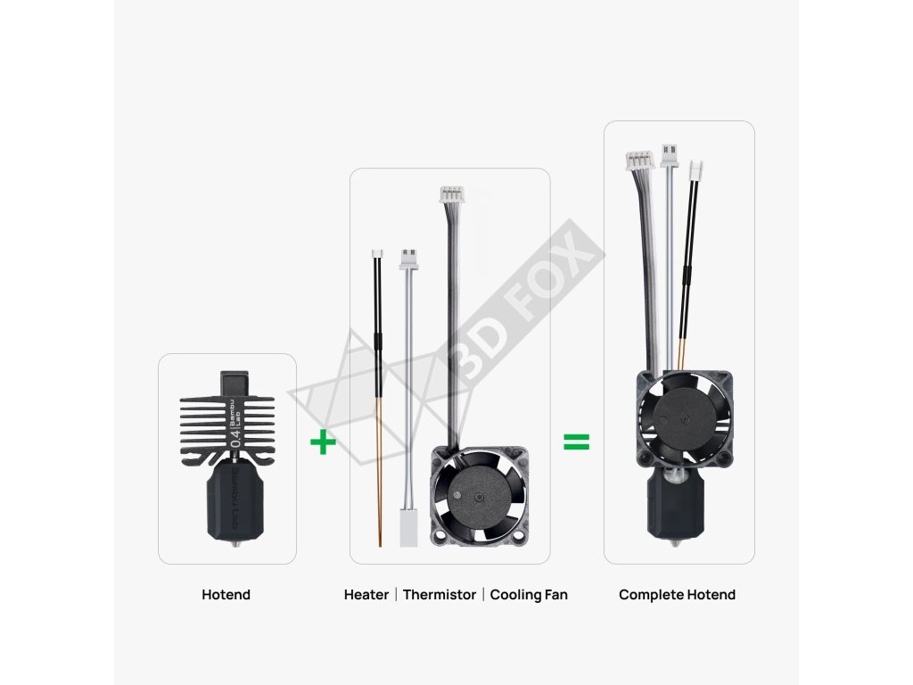 Bambu Lab bietet Hotends in zwei Konfigurationen an: ein reines Düsen-Hotend und einekomplette Hotend-Baugruppe. Die komplette Hotend-Baugruppe umfasst: [1]Hotend mit Düse, [2]Kühlgebläse, [3]Keramikheizelement und Thermistor, [4]Silikonsocke. Es wird vormontiert geliefert und ist sofort einsatzbereit für Ihren Bambu Lab 3D-Drucker. Wenn Sie die Düse austauschen müssen, können Sie entweder das Hotend mit der Düse der originalen kompletten Hotend-Baugruppe ersetzen oder die gesamte Hotend-Baugruppe austauschen.
