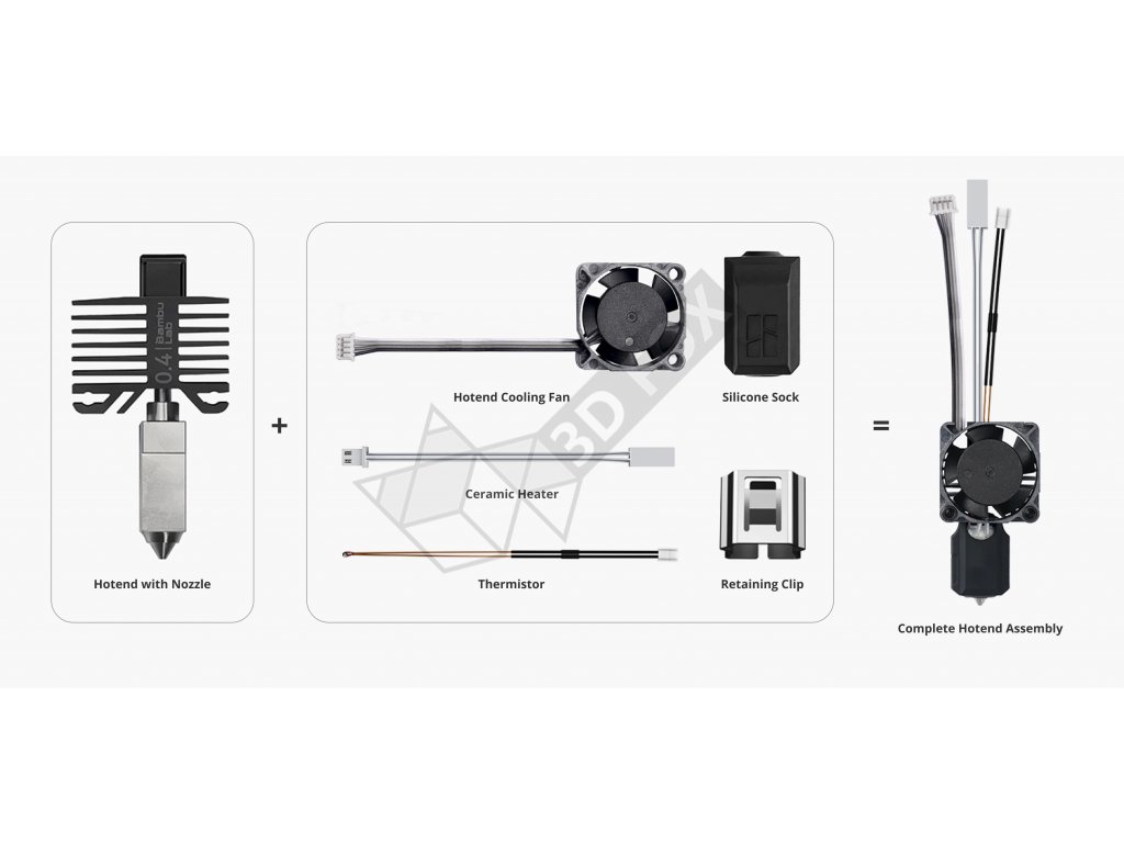 Bambu Lab bietet Hotends in zwei Konfigurationen an: ein reines Düsen-Hotend und einekomplette Hotend-Baugruppe. Die komplette Hotend-Baugruppe umfasst: [1]Hotend mit Düse, [2]Kühlgebläse, [3]Keramikheizelement und Thermistor, [4]Silikonsocke. Es wird vormontiert geliefert und ist sofort einsatzbereit für Ihren Bambu Lab 3D-Drucker. Wenn Sie die Düse austauschen müssen, können Sie entweder das Hotend mit der Düse der originalen kompletten Hotend-Baugruppe ersetzen oder die gesamte Hotend-Baugruppe austauschen.