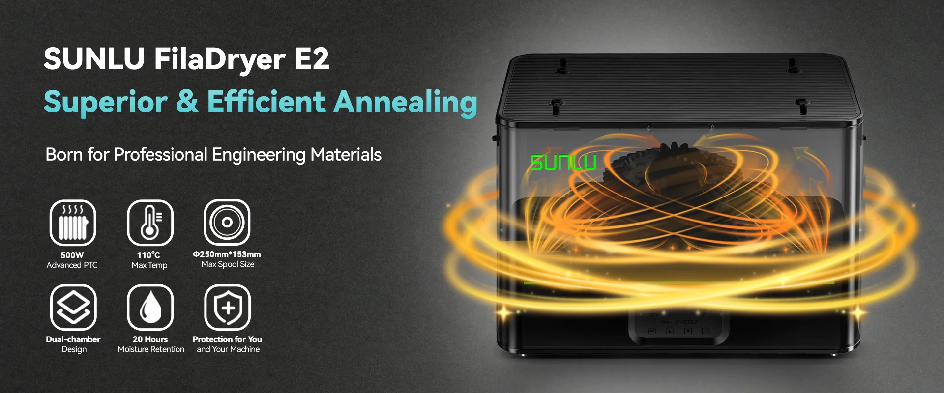 Der SUNLU FilaDryer E2 ist ein leistungsstarker 2-in-1-Filamenttrockner mit Glühfunktion, der speziell für technische Werkstoffe und Materialien entwickelt wurde. Dank seiner hohen Leistung kann er nicht nur Filamente schnell und effizient trocknen, sondern auch deren mechanische Eigenschaften durch kontrollierte Wärmebehandlung (Glühen) verbessern.